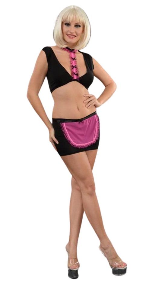 Женский черно-розовый костюм горничной. Состоит из 3 предметов: топа, юбки и фартука. В комплекте: топ, юбка, фартук.