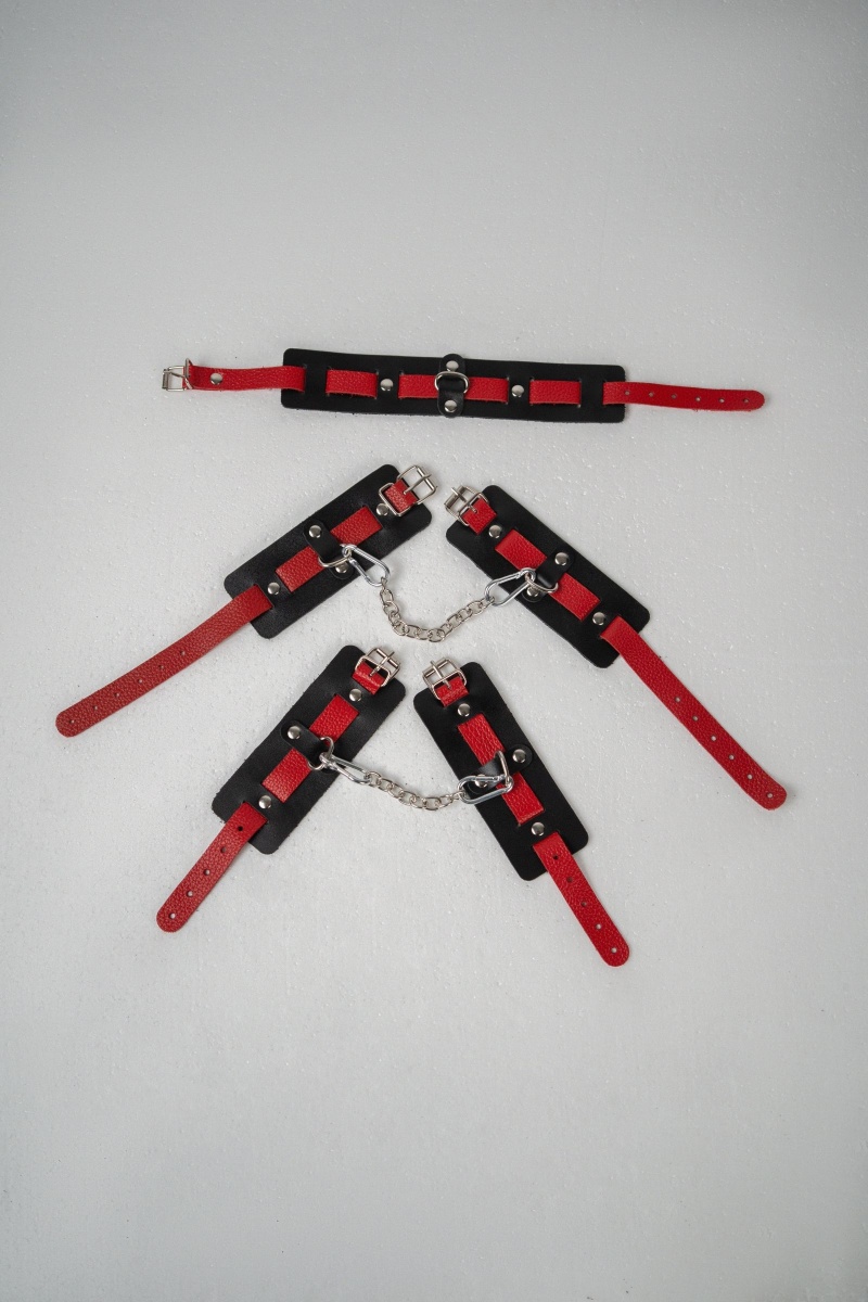 В набор входит ошейник, наручники и оковы. Ошейник состоит из двух элементов: основа прямоугольной формы из натуральной кожи черного цвета и ремешок красного цвета с прочной хромированной фурнитурой в виде овального кольца. Расположение ремешка через прорези основной части является декоративным решением, а также служит для лучшей регулировки размера. Наручники состоят из двух деталей: основа прямоугольной формы из натуральной кожи черного цвета и ремешок красного цвета с прочной хромированной фурнитурой в виде овального кольца. Расположение ремешка через прорези основной части является декоративным решением, а также служит для лучшей регулировки размера. В комплект входит соединительная цепочка с двумя карабинами. Оковы состоят из двух деталей: основа прямоугольной формы из натуральной кожи черного цвета и ремешок красного цвета с прочной хромированной фурнитурой в виде овального кольца. Расположение ремешка через прорези основной части является декоративным решением, а также служит для лучшей регулировки размера. В комплект входит соединительная цепочка с двумя карабинами. Длина ошейника - 47 см, ширина - 5,5 см. Обхват ошейника - 34-44 см. Длина наручника - 25 см, ширина - 6 см. Обхват наручников - 15-22 см. Длина оков - 32 см, ширина - 6 см. Обхват оков - 20-29 см.