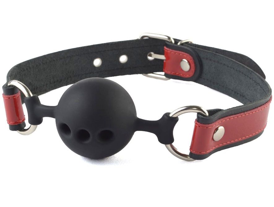 Кляп с оригинальным кожаным ремешком и лаковыми вставками красного цвета. Сам кляп-шар изготовлен из силикона в черном исполнении, приятного на ощупь, со специальными отверстиями, пропускающими воздух.
