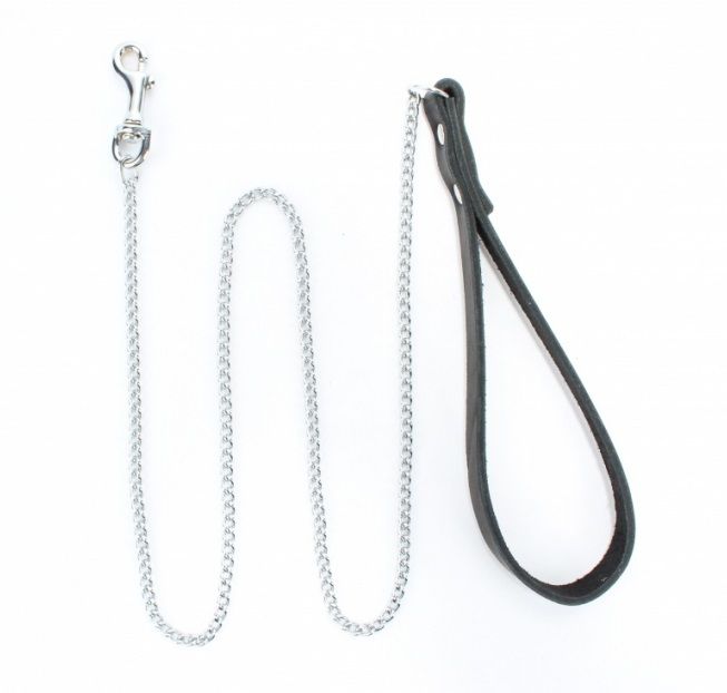 Поводок изготовлен из натуральной кожи. При изготовлении использована фурнитура с никелевым покрытием. Металлическая цепочка (поводок), с карабином на конце, поможет вам с лёгкостью управлять своим партнёром. Длина цепочки - 85 см., ширина - 0,5 см.